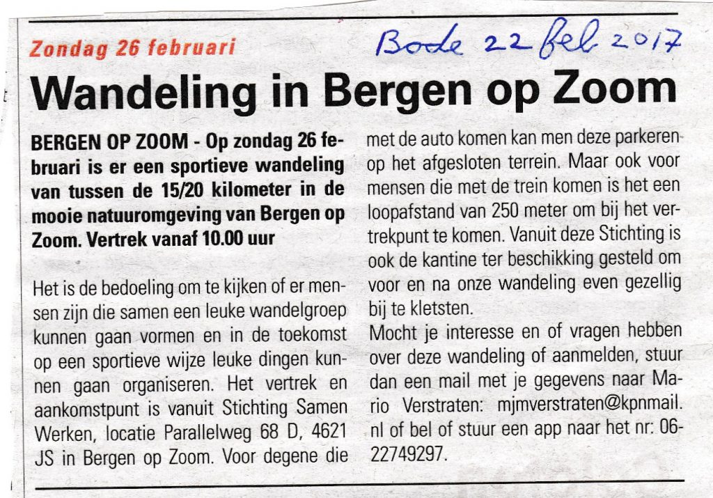 Wandel je gezellig met ons mee? Laat even weten of je komt via e-mail, WhatsApp of Facebook